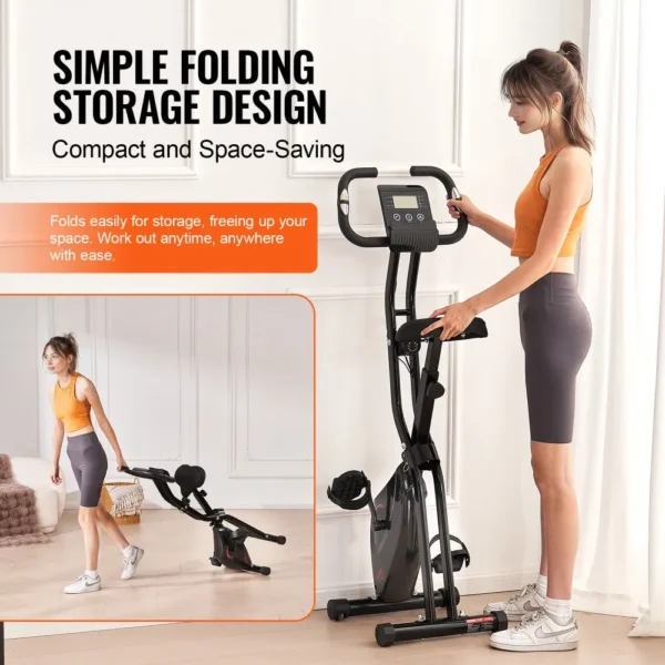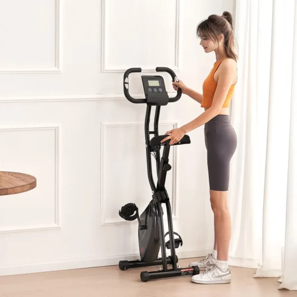 Plegable y portátil: Diseñada para plegarse fácilmente, esta bicicleta estática es compacta y ahorra espacio. Incluye ruedas de transporte para moverla y guardarla fácilmente.