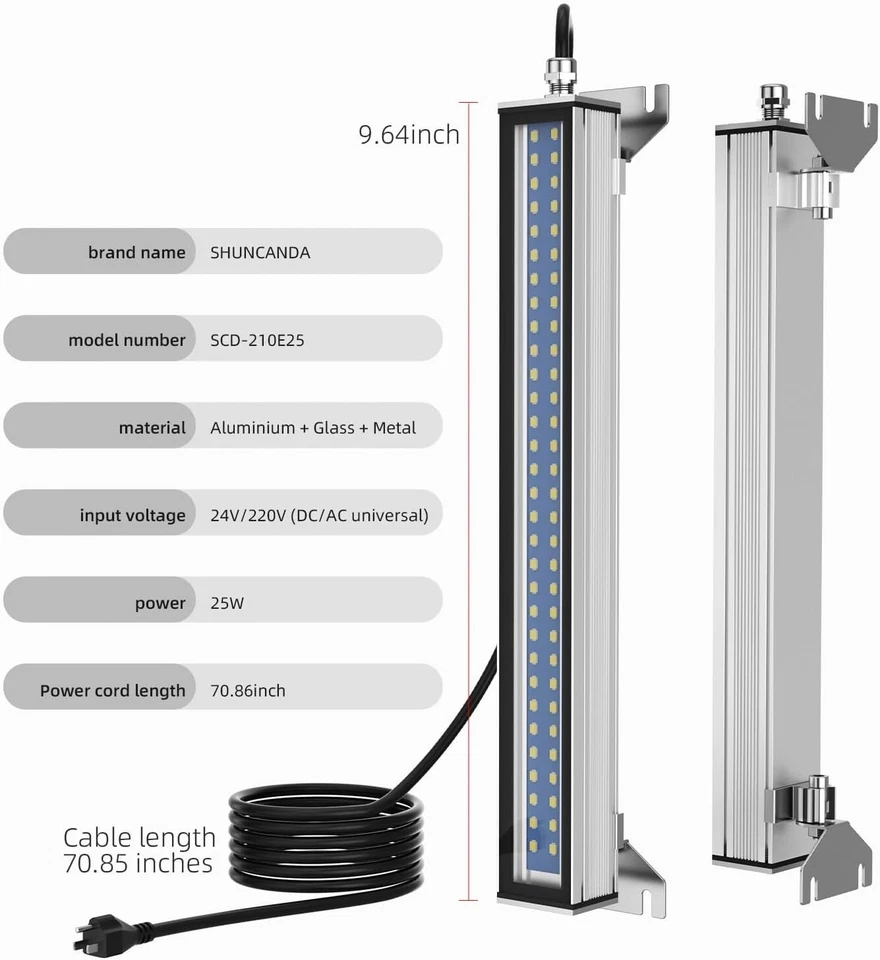 Especificaciones de la luz para maquinaria: Funciona a 25 W con un rango de voltaje de 110-220 V (entrada de 120 V). Cuenta con dos filas de bombillas LED, que ofrecen una baja emisión de calor y un amplio rango de iluminación.