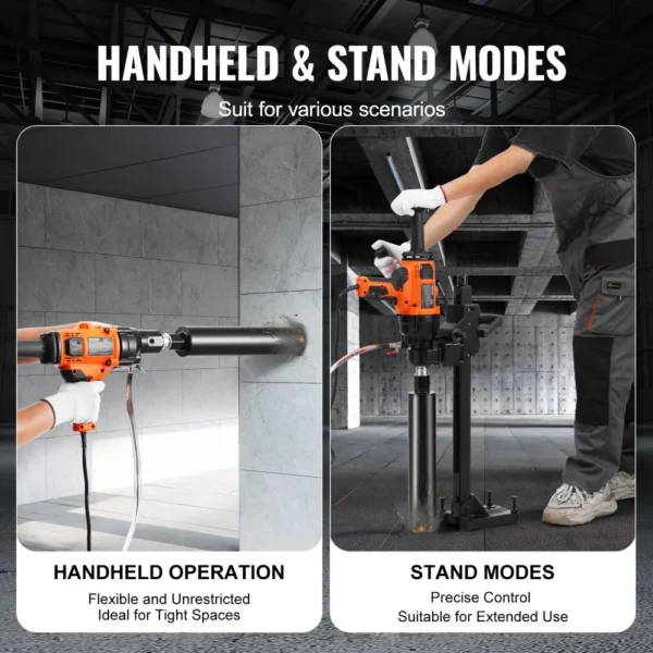 Portátil y compatible con soporte: El modo portátil de la perforadora es perfecto para tareas que requieren movilidad flexible y control preciso, como reparaciones domésticas y pequeños proyectos de perforación, lo que hace que la operación sea más fluida y cómoda. El modo de soporte proporciona un soporte firme para proyectos más grandes y tareas de perforación de alta estabilidad.