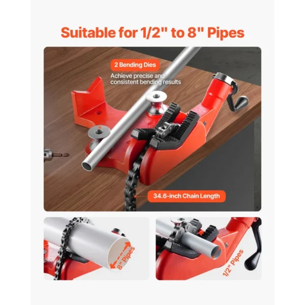 Gran capacidad de sujeción: El tornillo de banco de cadena VEVOR se adapta a una amplia gama de diámetros de tubería, con una capacidad de sujeción de 1/2″ a 8″ y una longitud de cadena de 34,6 pulgadas. Incluye dos matrices de doblado para doblar tuberías con precisión.